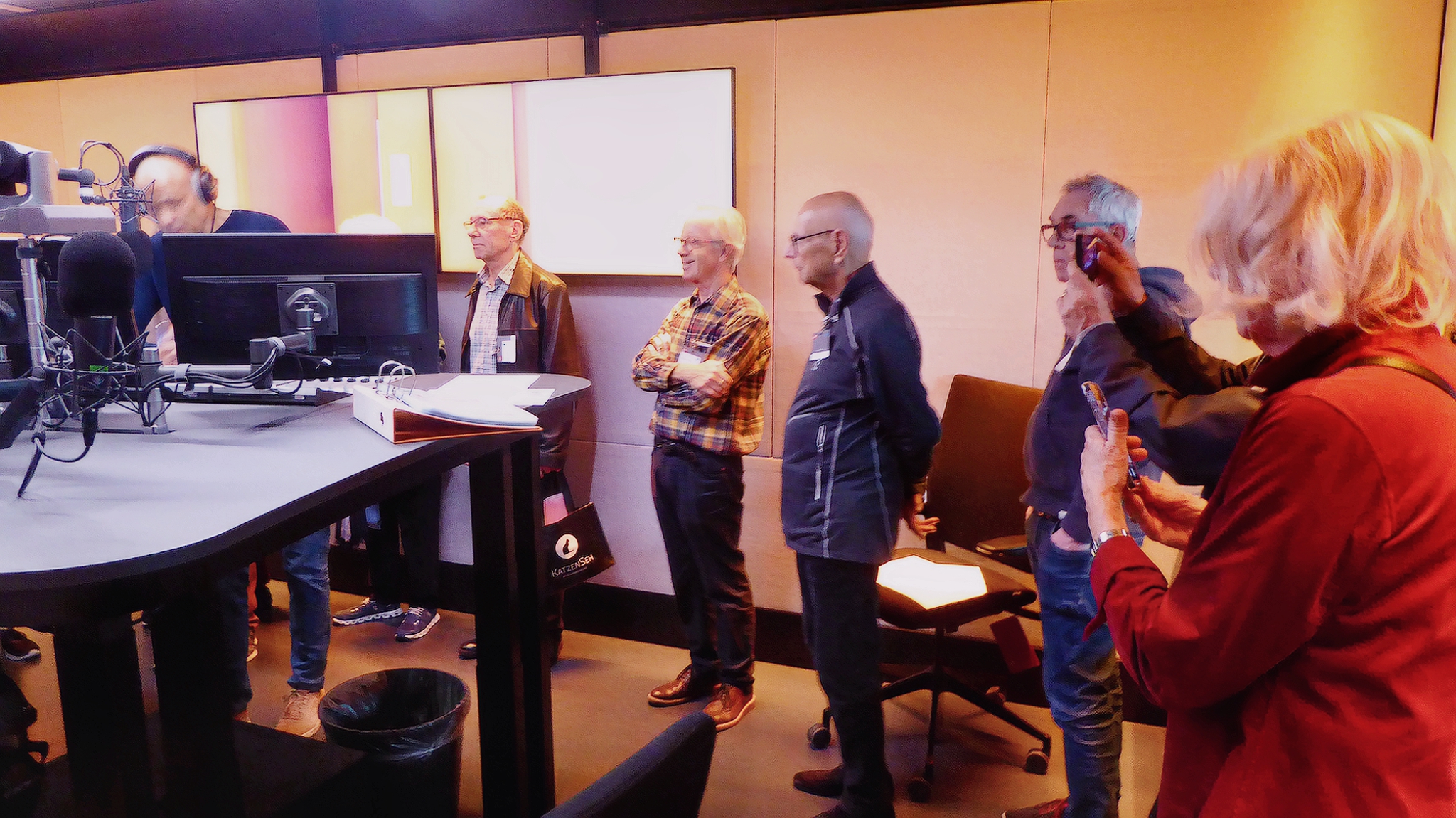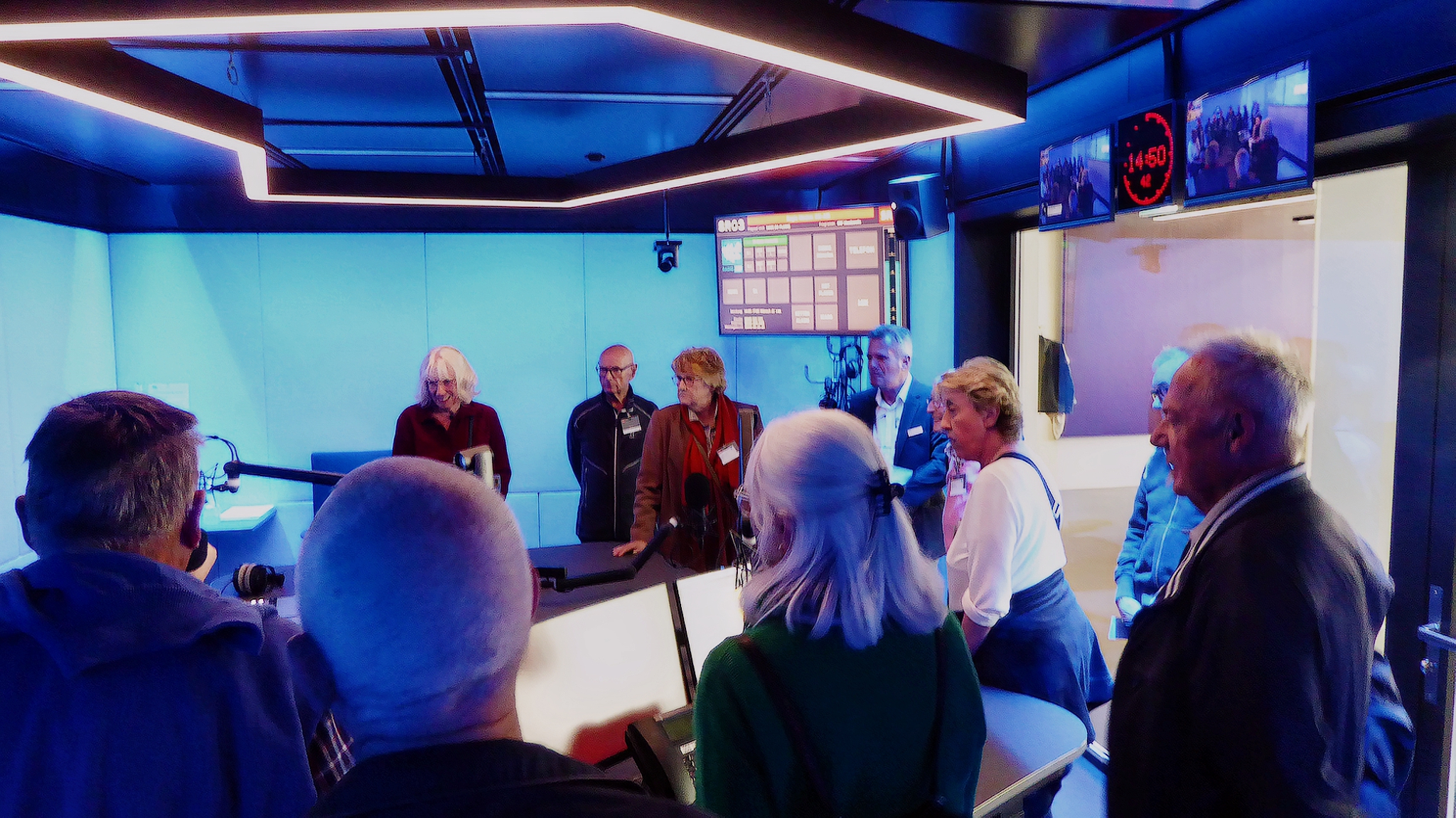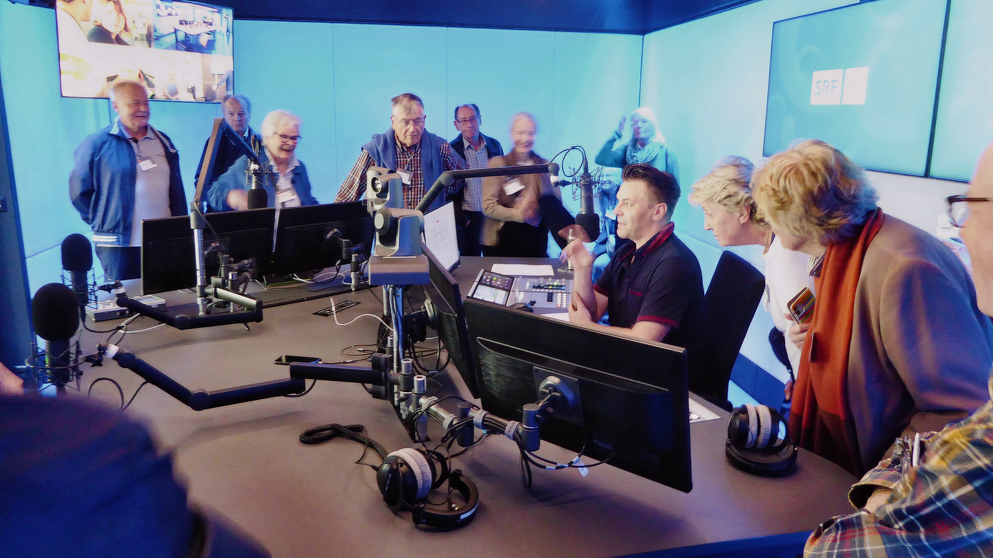 Der Kontakt während dem laufenden Betrieb mit den ModeratorInnen zeigte für uns eindrücklich, wie heute Radio gemacht wird. Die neue Infrastruktur wird gelobt und sei einfacher zu bedienen gegenüber der früheren Sebstfahrtechnik sagen ModeratorInnen. Interessant war zu sehen wie der Kontakt mit HörerInnen im laufenden Betrieb und die Wahl eines gewünschten Musikstückes erfolgt. Ein weiteres Beispiel war die sofortige Umstellung im Programm als Anlass zum Rücktritt von Bundesrätin Sommaruga. Die Einschaltung der News aus der Nachrichtenredaktion, die im News- und Sportzentrum untergebracht ist, zeigte exemplarisch wie die neuen Prozesse im Betrieb funktionieren und aktueller nicht sein könnten. Das Outfit der Studios wird je mit einer passenden Farbe pro Radiokanal und einem auf einer Monitorwand sichtbarem "Brand" gekennzeichnet. Diese Darstellung kann durch den Moderator, je nach Sendetyp, umgestellt und angepasst werden.