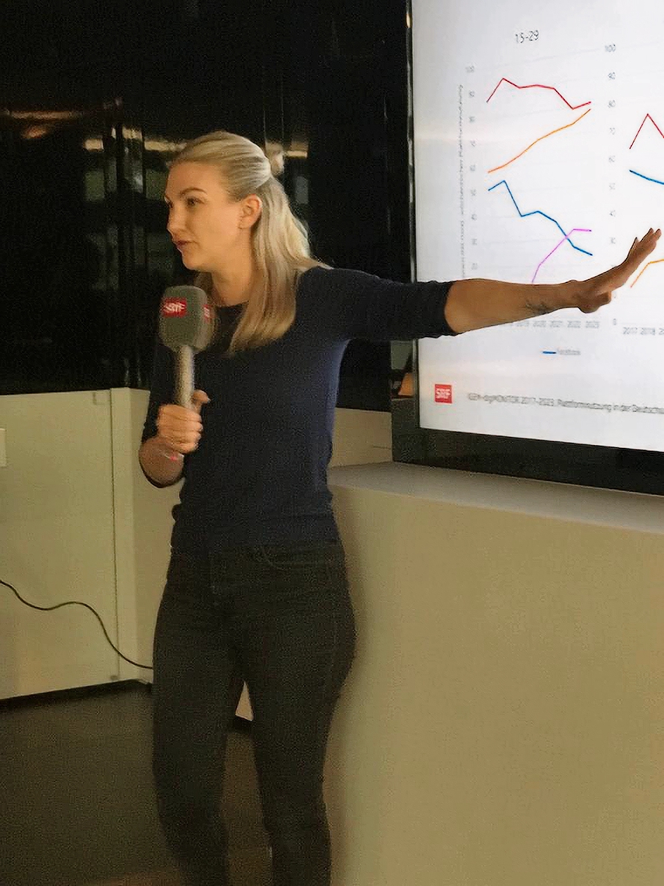 Im Anschluss an die Besichtigung erläuterte uns Viviane Aubert - Leiterin Digitale Kanäle Hub- und Formatmarken – welche Social Media Kanäle SRF bewirtschaftet, welche Inhalte wo zu finden sind und die Beweggründe von SRF, sehr aktiv in diesem Bereich tätig zu sein (hier finden sie zu diesem Thema mehr).