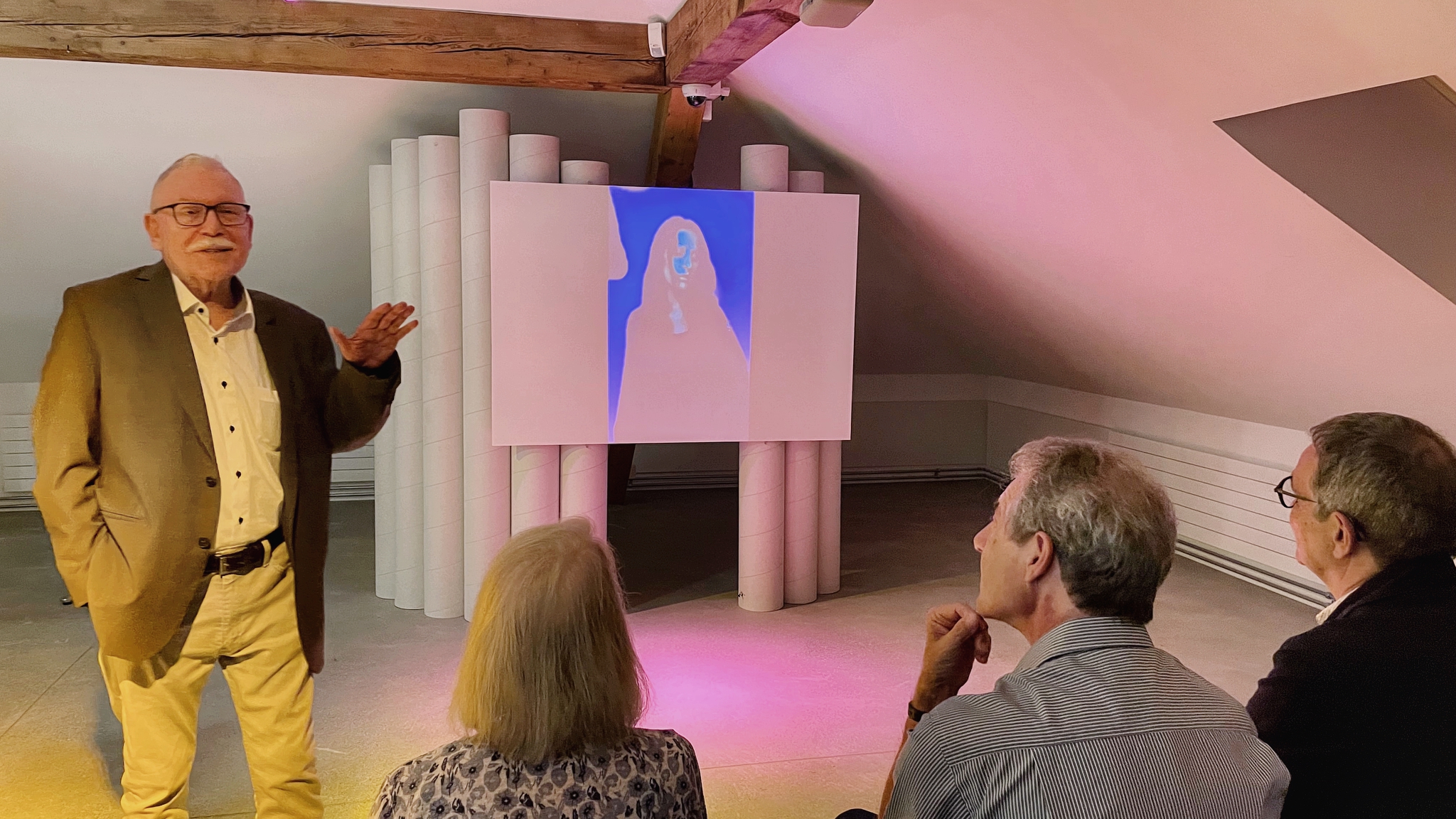 Peter Kaufmann (Mitglied des VP-SRF) führte die Besuchergruppe der SRF-Pensionierten vor der Ausstellung «Music Scene» ins Thema ein und erzählte Interessantes über die Zusammenarbeit mit Franz Gloor und die Wiederentdeckung des Fotoarchivs.