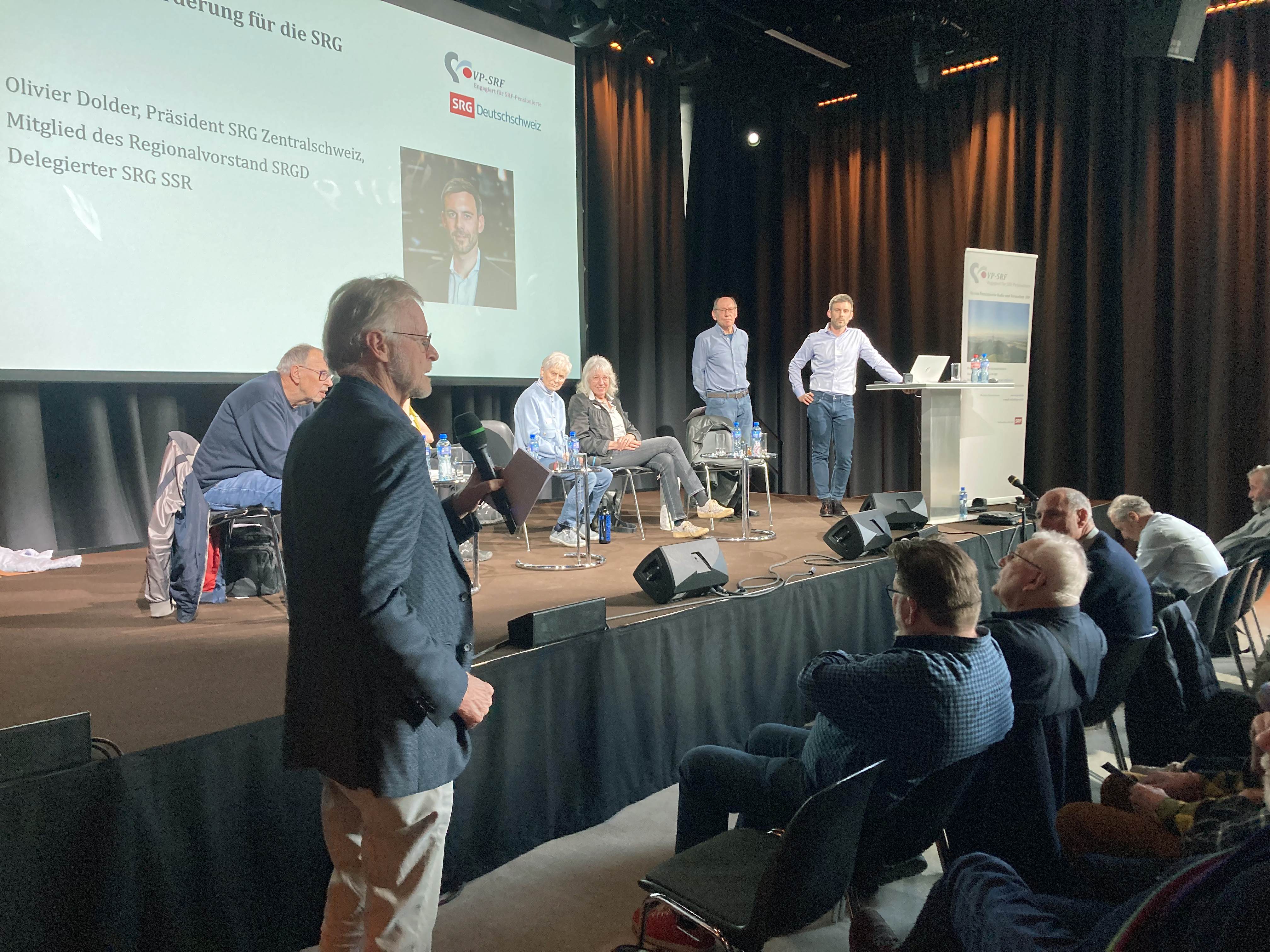 Nach der Mitgliederversammlung sprach Olivier Dolder, Präsident der SRG Zentralschweiz und Mitglied des Regionalvorstandes der SRG Deutschschweiz, über die Herausforderungen für die SRG. Dolder begann mit dem Hinweis, dass die SRG bereits 120 Mio Franken gespart hat und bis 2029 weitere 270 Mio sparen muss. Die Gründe dafür: Die Senkung der Haushaltabgabe auf 300 Franken durch den Bundesrat, die mögliche Befreiung weiterer Unternehmen von der Medienabgabe sowie rückläufige Werbeeinnahmen und die Teuerung.
